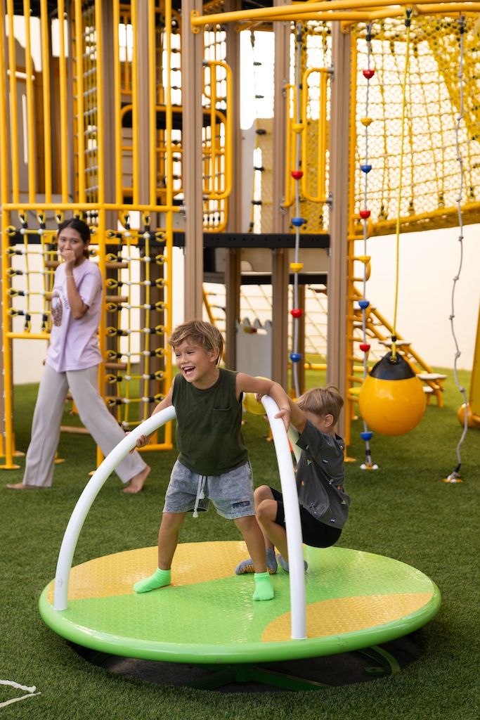 It's the kind of place where you can actually let your child play on their own - and feel confident they're safe. Their common spaces are built for connections and play, from the biggest LEGO wall on the island and a magical treehouse to swings and climbing nets. Families love how the resort is designed with little ones in mind: wide paths for strollers and runners, cozy villa corners with chalk-friendly surfaces, and private pools with shallow zones for younger swimmers. There's no need to pack floaties either, as a full set of inflatable toys for all ages is already waiting.