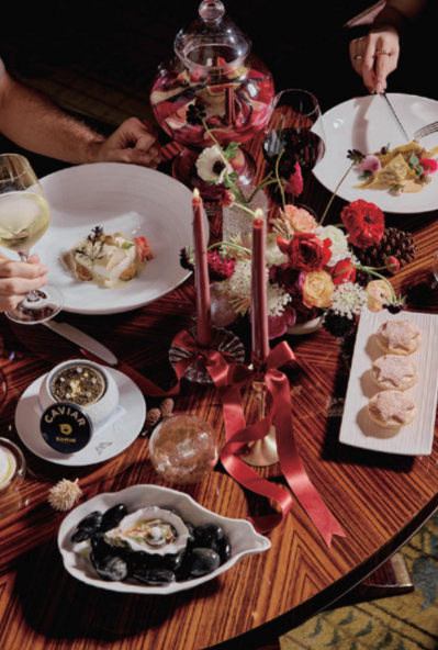 Indulge in the festive spirit with Salisterra's festive afternoon tea, available daily from 3:00 pm to 5:00 pm. Savor a delectable selection of savory bites, including Ox Cheek Pithivier and Duck Rillette, alongside freshly baked scones with clotted cream and jam. Sweet treats like Chocolate & Mint Yule Log and Chestnut Cherry Mont Blanc complete the experience.
