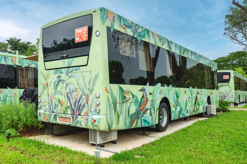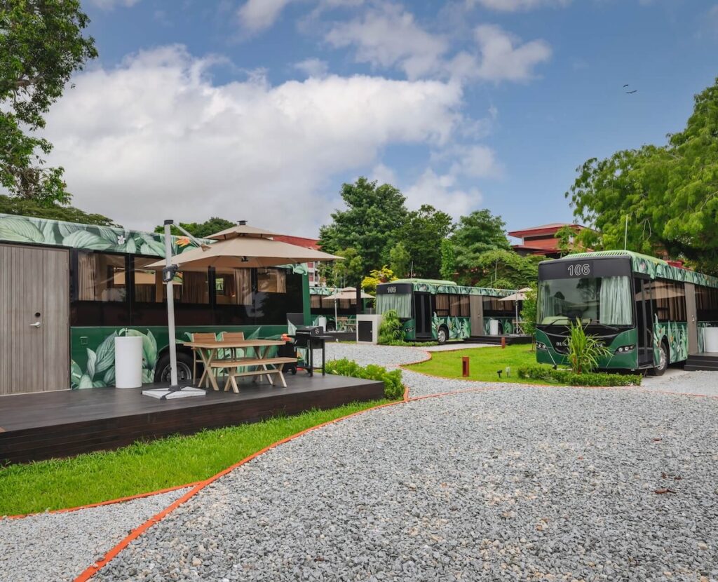 Get ready for the quirkiest staycation in Singapore! Nestled on 8,600 sqm at 5 Telok Paku Road, The Bus Collective is Southeast Asia’s first resort hotel made from decommissioned SBS buses. The compound boasts 20 bespoke 45 sqm suites—each a fully refurnished single-decker complete with a private patio, BBQ pit, flat-screen TV, rain shower, minibar, and Wi‑Fi. With the preserved driver’s cockpit and original fixtures still intact, guests of all ages can enjoy the charm of bus nostalgia with the comfort of resort amenities.